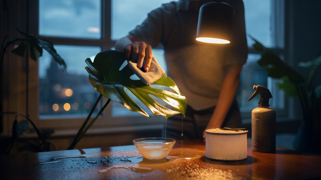 To apply, mist a microfibre cloth with the emulsion and buff each leaf’s top side, following the vein. For delicate species, spray lightly then dab away excess. Leave overnight in a ventilated room. In the morning, wipe with clean water to lift loosened dust and any remaining film. Never allow pools to sit in crowns; they rot. Repeat no more than monthly in growing season. Skip flowers, fuzzy leaves, and succulents, which dislike films on their skin.
